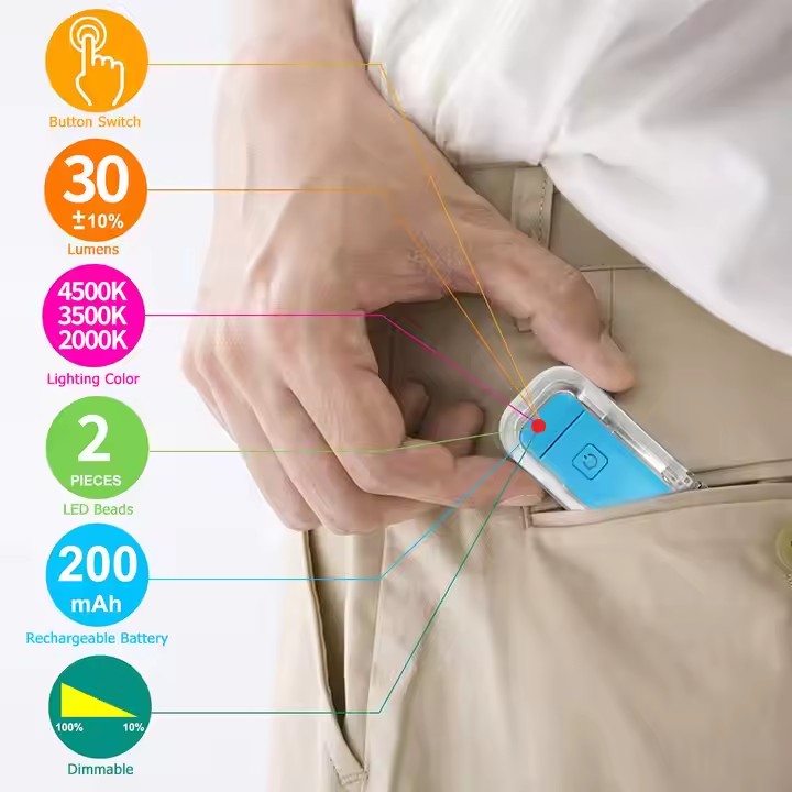 This USB-rechargeable LED book light is crafted from ABS plastic, offering a portable and foldable design with adjustable brightness across 9 levels