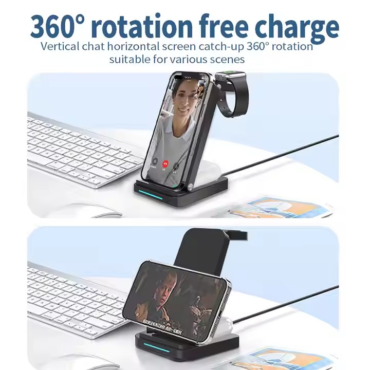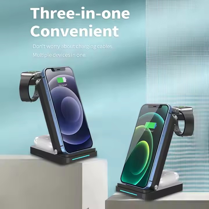 This 3-in-1 Foldable Wireless Charger supports fast charging for multiple devices like mobile phones, smartwatches, and earphones with a maximum output of 15w